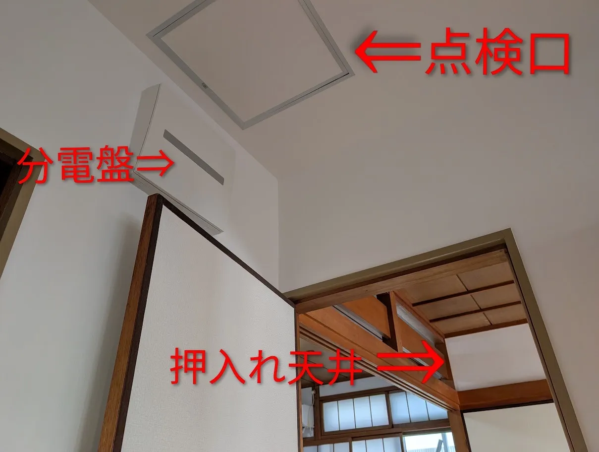 押入れ天井までの部分で、配線は隠蔽になっています(画像1枚目)
