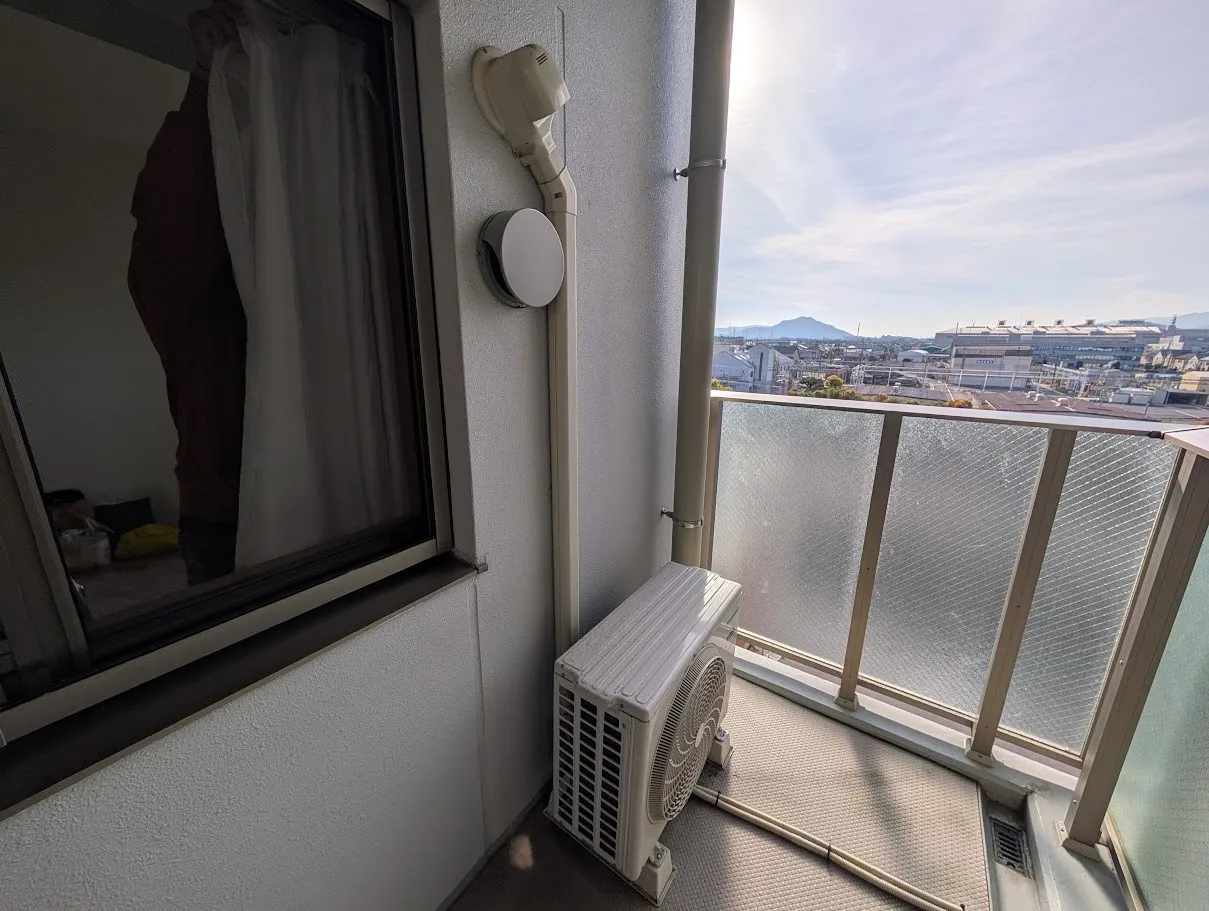 室外機の設置は、平屋根ですので危険度は低いです(画像3枚目)