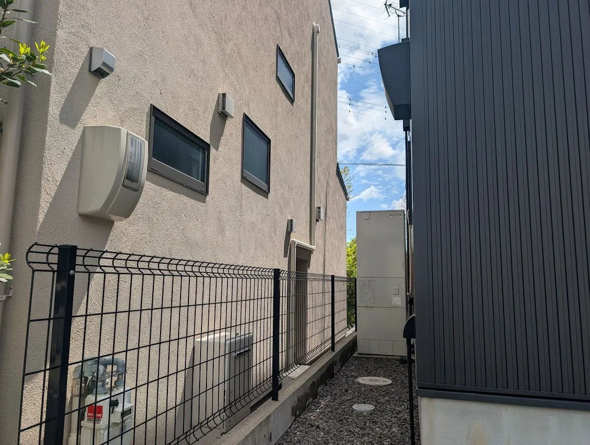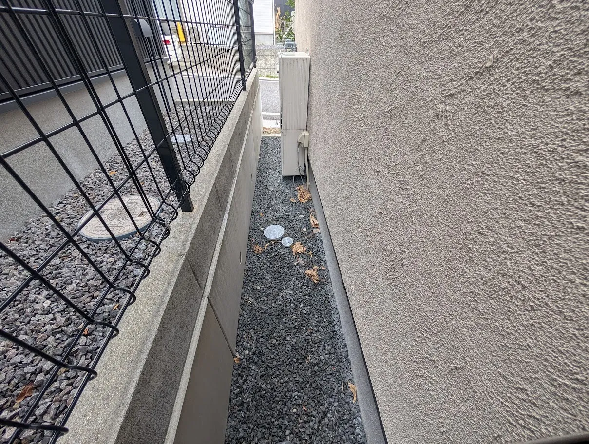 今回の難所は、建物とブロック塀の間が約530mmしかない狭小スペースでの高所作業です!